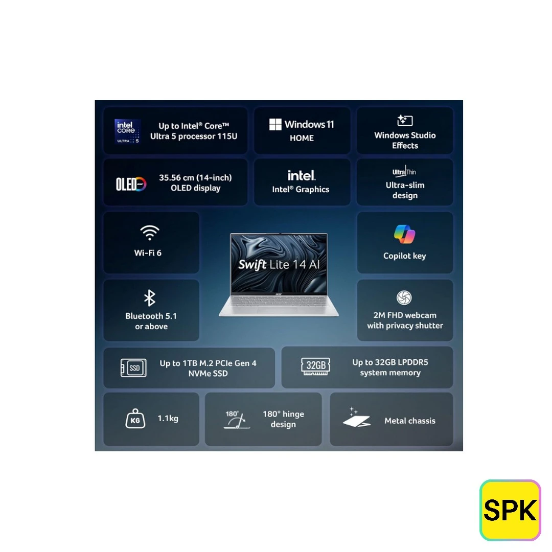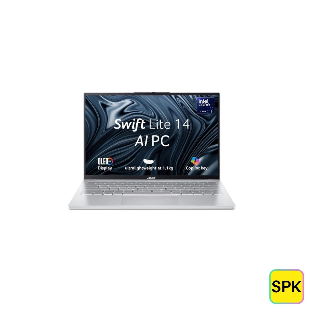 The Acer Swift Lite 14 AI (SFL14-54M-505S) 2025 is a lightweight and stylish laptop designed for everyday productivity and creative tasks. Featuring a crisp 14-inch WUXGA OLED display with 100% DCI-P3 color gamut, it delivers vibrant visuals perfect for media consumption and work. Powered by Intel Core Ultra processors, it ensures efficient multitasking and fast performance in a sleek, portable design.