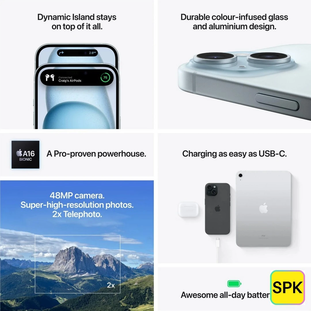 Equipped with a 48MP main camera and a 12MP ultra-wide camera, the iPhone 15 captures high-resolution photos with improved low-light performance. The 2x telephoto zoom feature allows for versatile photography options. The 12MP front-facing camera supports high-quality selfies and video calls, featuring enhanced image processing for clearer and more vibrant self-portraits.