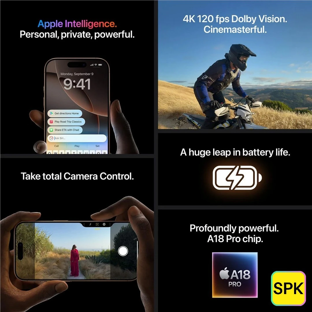 Powered by the A18 Pro chip (built on a 3 nm process) with a 6-core CPU (2 performance + 4 efficiency cores), 6-core GPU, and a 16-core Neural Engine, the iPhone 16 Pro is optimized for both high performance and energy efficiency—ideal for demanding tasks, gaming and AI-powered features.