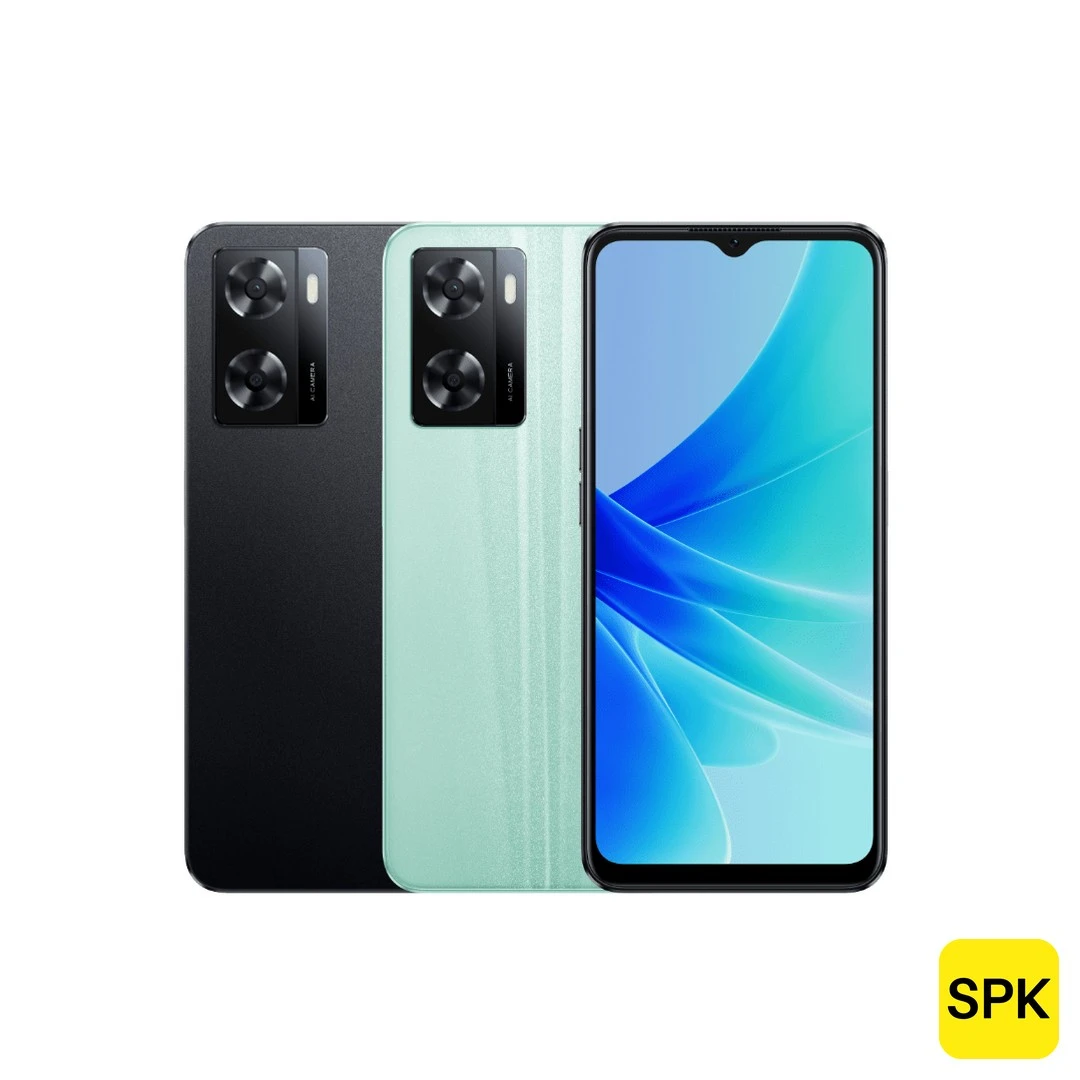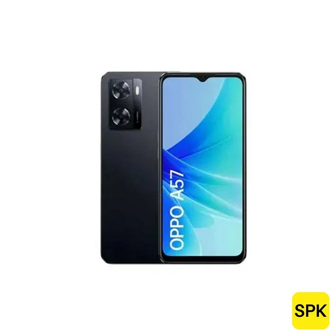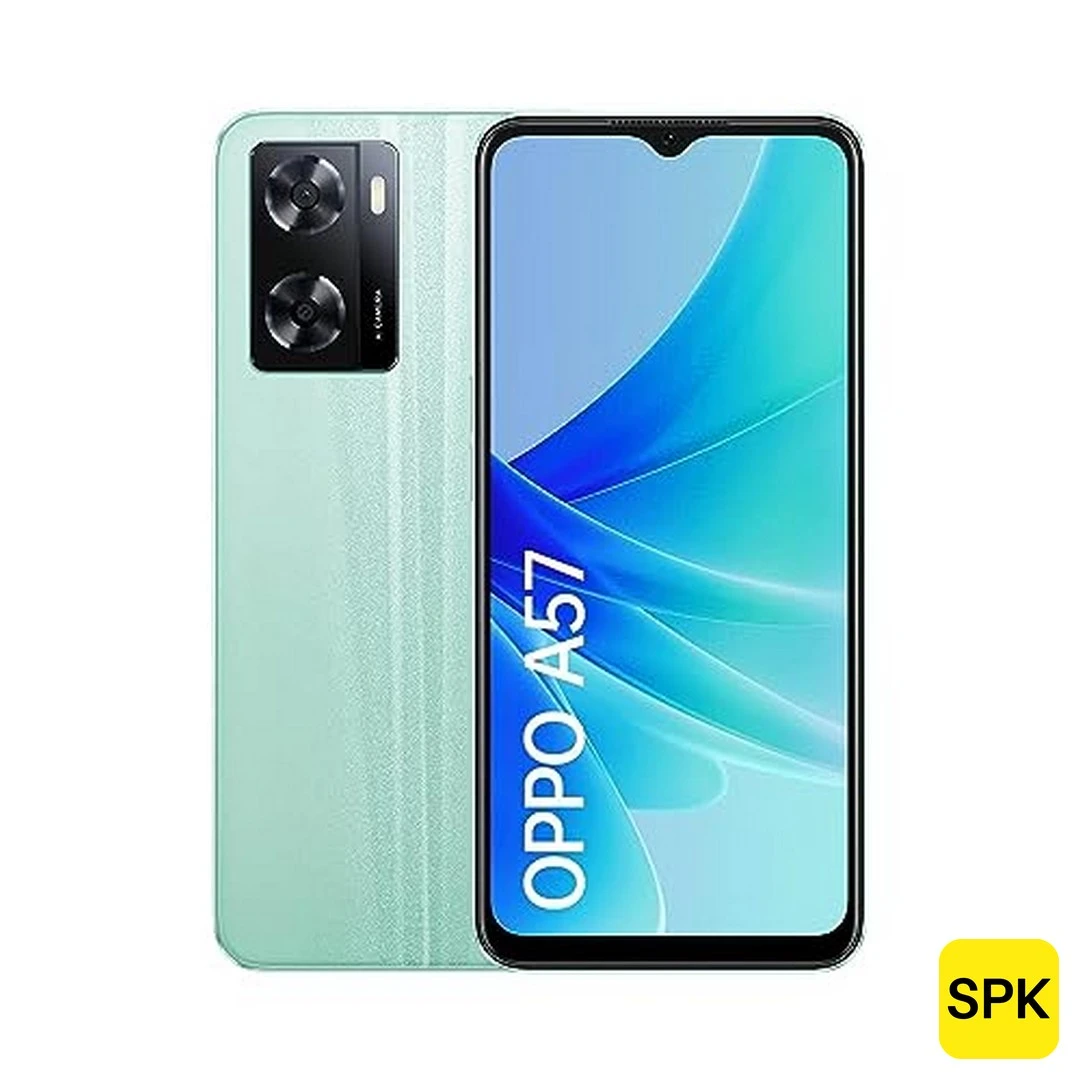 The OPPO A57 4G is a budget-friendly smartphone launched in May 2022, featuring a 6.56-inch IPS LCD display with HD+ resolution of 720 x 1612 pixels and a standard 60Hz refresh rate. Powered by the MediaTek Helio G35 (12nm) octa-core processor combined with a PowerVR GE8320 GPU, this device is designed for basic daily tasks and casual use. It offers configurations with 4GB RAM and 64GB of storage, expandable via microSDXC. The rear camera system comprises a 13MP main sensor and a 2MP depth sensor, while the front camera sports an 8MP sensor. It houses a large 5000mAh battery supporting 33W SUPERVOOC fast wired charging that provides a 50% charge in approximately 30 minutes. The phone runs Android 12 with ColorOS 12.1 and is upgradeable to Android 14 with ColorOS 14. Built with a glass front, plastic frame, and plastic back, the OPPO A57 4G is IP5X/IPX4 rated for dust and water resistance. Additional features include a side-mounted fingerprint sensor, stereo speakers with DIRAC 3.0 sound enhancement, and dual SIM functionality. Available colors are Glowing Black and Glowing Green.